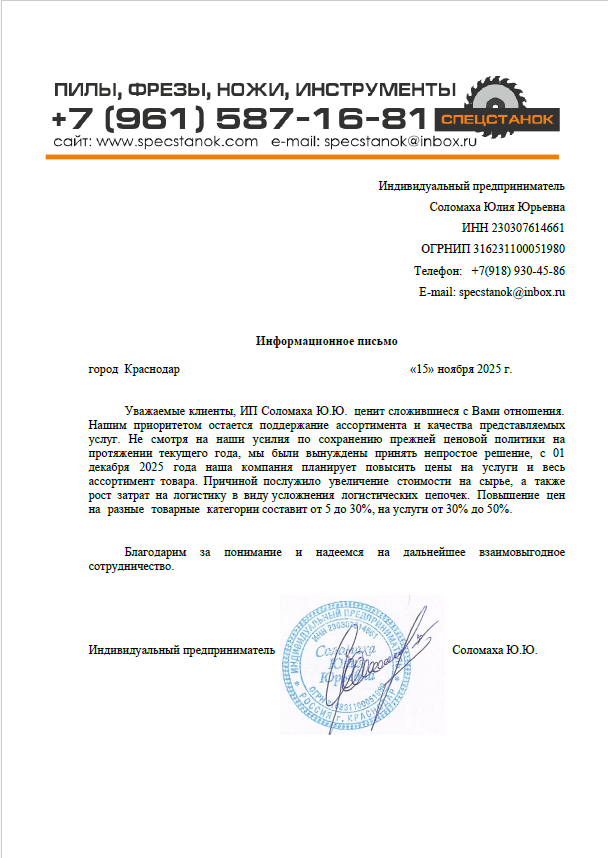 Не смотря на наши усилия по сохранению прежней ценовой политики на протяжении текущего года, мы были вынуждены принять непростое решение, с 01 декабря 2025 года наша компания планирует повысить цены на услуги и весь ассортимент товара. Причиной послужило увеличение стоимости на сырье, а также рост затрат на логистику в виду усложнения логистических цепочек.